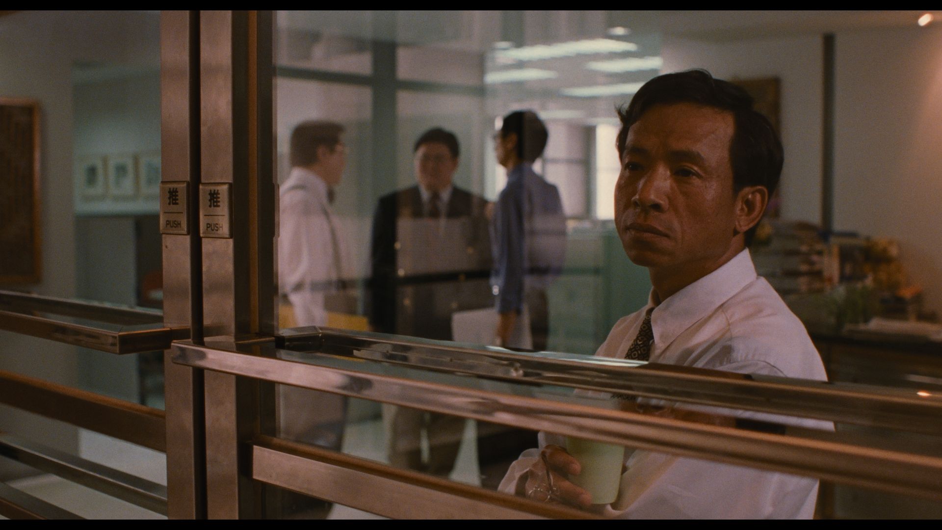 Yang’s use of this combination of techniques is especially evident in his depiction of NJ in the workplace, with a clear example occurring in the scene captured above. NJ is shot through glass doors, positioned in the foreground to the right of the frame, while his three coworkers converse together in the background on the left. This spatial division within the frame highlights his literal and figurative separation from his colleagues, visually emphasising his alienation and sense of insignificance within his professional environment and, as the film gradually reveals, within society at large. Through the repeated utilisation of such compositions, Yang’s direction consistently echoes Yi Yi’s broader themes of loneliness, dissatisfaction, and a persistent longing for connection.