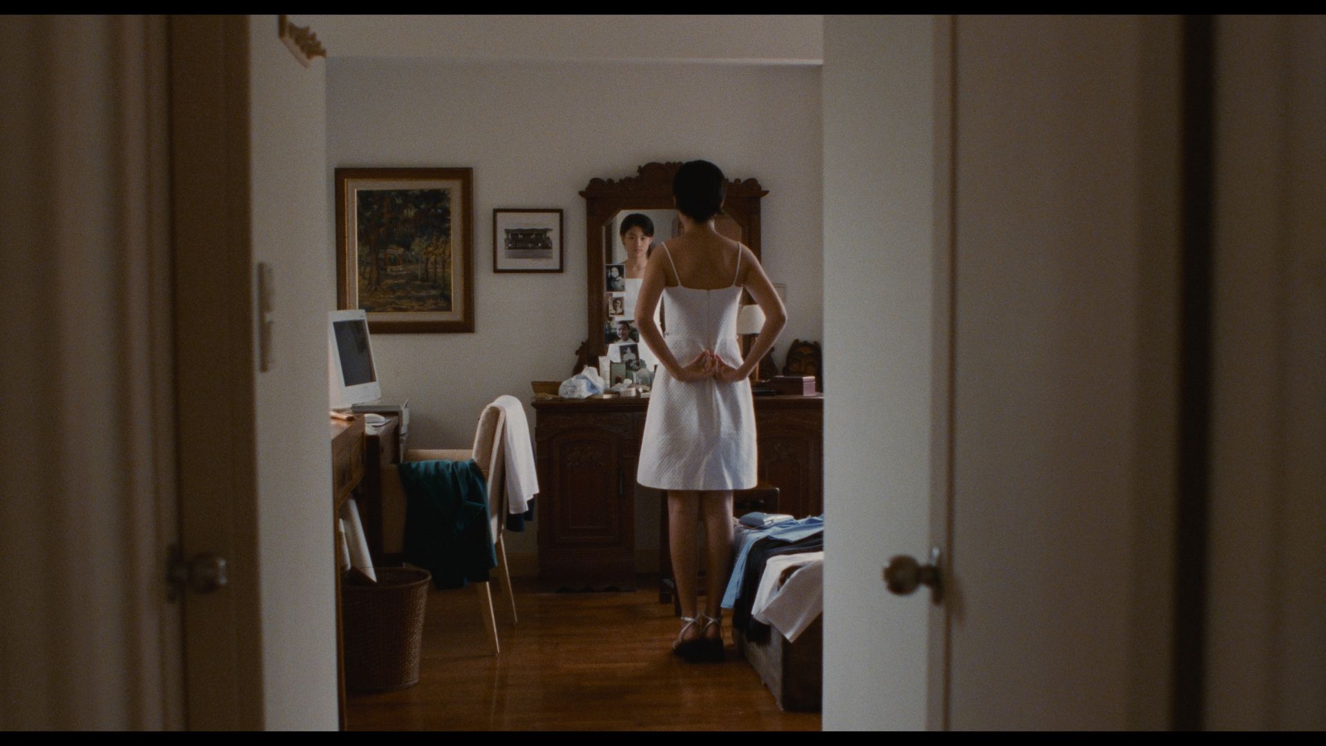 Notably, these frames do not merely organise space. They enclose the characters, isolating them from one another and from the world around them. These characters are visually confined within architectural boundaries, just as they are trapped and held back by their own internal struggles, suggesting a deeper emotional restraint that corresponds with their inability to fully articulate their feelings of guilt, regret, and desire. This is especially evident in scenes involving NJ and Ting-Ting, who are repeatedly framed through windows, mirrors, or doorways during moments of quiet reflection, underscoring their emotional distance from others even as they are physically present. The use of mirrors provides further nuance by introducing double images, drawing parallels with the film’s preoccupation with self-examination and inner conflict, and ultimately reinforcing the emotional isolation central to the essence of these characters.